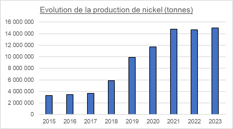 | Production de nickel (tonnes) | 379 800 | 889 585 | 660 144 | 1 347 975 | 1 764 150 | 1 840 795,6 | 2 480 548,22 |