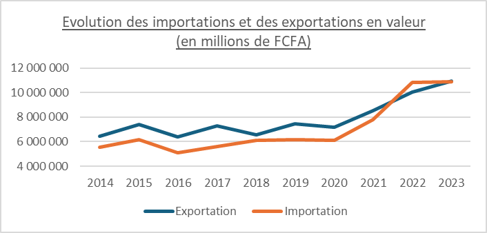 From 2014 to 2023, Côte d'Ivoire's external trade was marked by an increase in exports and imports in value, averaging 6.1% and 7.8% annually, respectively. The trade balance, which remained in surplus until 2021, showed a deficit of 826.6 billion FCFA in 2022. In 2023, it returned to a surplus of 66.1 billion FCFA.