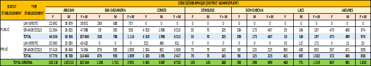 The geographical distribution of higher education institutions indicates that all districts have at least one higher education establishment, with the exception of the Woroba District. The Autonomous District of Abidjan represents a zone of very high concentration, housing 440 universities and grandes écoles, accounting for 71.43%. This is followed by the districts of the Bandama Valley, Yamoussoukro, and the Lagunes, which have 32, 28, and 20 establishments respectively, representing 5.19%, 4.55%, and 3.25% of the universities and grandes écoles in Côte d'Ivoire.