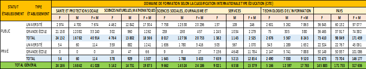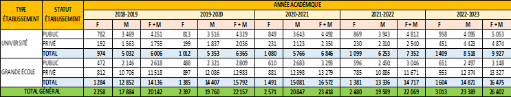 Between 2013 and 2023, the higher education landscape experienced significant expansion (see Tables 1.1 and 1.2). The number of public universities nearly doubled, increasing from 5 to 9, with the establishment of the Virtual University of Côte d'Ivoire (2016) and the universities of Man (2016), San-Pedro (2021), and Bondoukou (2023). In the private higher education sector, the number of institutions tripled. There were 571 private institutions in 2022-2023 compared to 189 in 2013-2014, representing a growth of 202%.