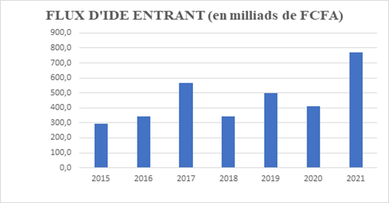 Côte d'Ivoire recorded a sustained average growth of incoming FDI flows of 26% between 2015 and 2021. Thus, the incoming FDI flow more than doubled during this period, reaching 772.1 billion FCFA in 2021. With nearly 30% of the total FDI stock of UEMOA, the country is the leading one in the West African franc zone and the 3rd in ECOWAS after Nigeria and Ghana.