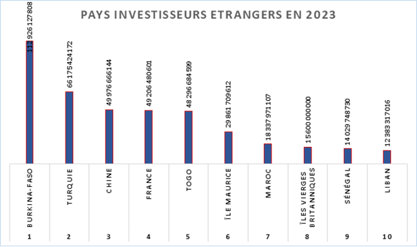Furthermore, Côte d'Ivoire recorded incoming FDI flows of 1,752.56 million USD (1,051.536 billion FCFA) in 2023 and outgoing FDI flows of 214.91 million USD (128.946 billion FCFA) (source: UNCTAD).